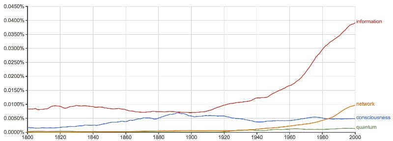 I find such questions strange. They assume that Humpty Dumpty has broken down and shattered into a million pieces. Some consciousness theorists look at the mess on the floor and wonder how they can put HD back together again. Others think consciousness itself is fundamental, that matter arises out consciousness. If that seems outlandish, then talk to quantum physicists, who are increasingly thinking that information comes before matter. Information based approaches to consciousness are hot these days. The new kid on the block is integrated information theory, IIT, due to Guilio Tononi and enhanced by Christof Koch. I will attempt a thorough analysis of Tononi's ideas in a future newsletter. Meanwhile, Ngram viewer confirms that we're living in the age of information.