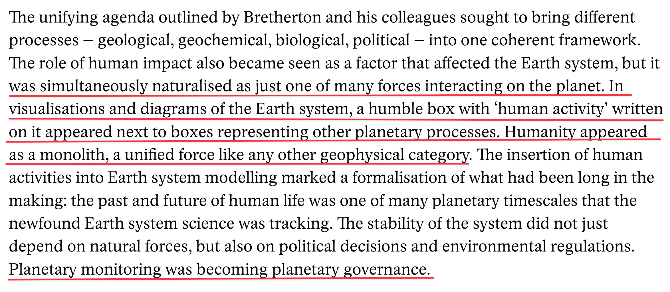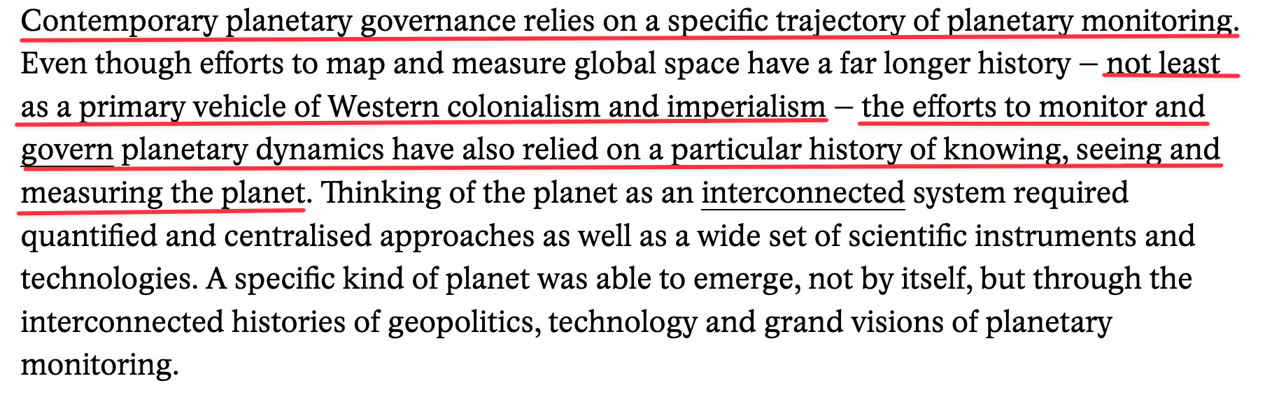 The alternative view of the same developments: knowing, measuring and managing the planet is continuous with the colonial enterprise of measuring and knowing the populations and geographies they colonized and whatever imperial expansion needed to extract profit. Keynes himself was deeply implicated in the colonial enterprise and didn’t care much about Britain repaying its debts to the colonies or the human cost in the colonies of the wars started by the imperialists. During the Bretton-Woods conference: