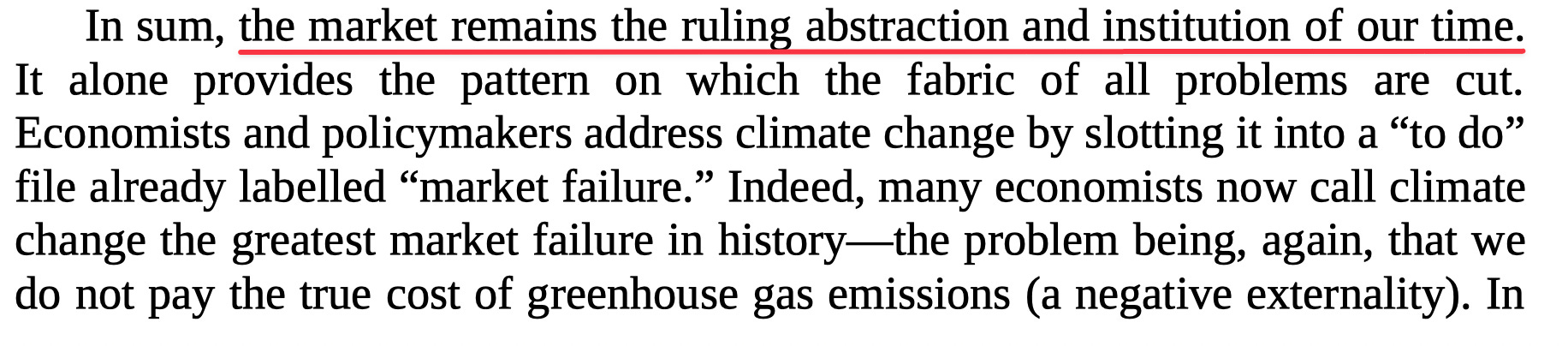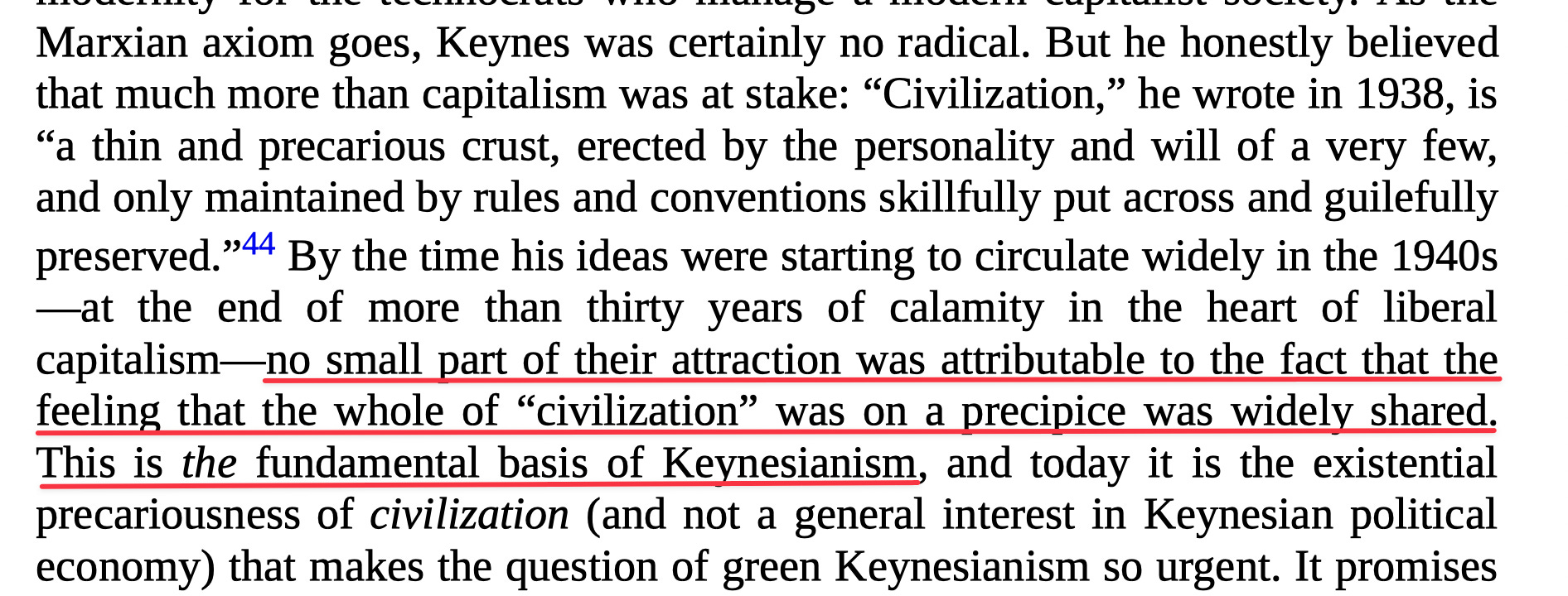 That’s the neoliberal approach to the planet in a sentence: bring the best experts on climate science and climate policy in room, surround them with the best climate models and crank out future scenarios by the dozen. For the neoliberals, climate change is a very large but solvable crisis, i.e., a phenomenon well understood within the history of the capitalist system. Internal contradictions within that system (say, between energy needs and carbon emissions) prompt institutions to reconsider, correct their course and create new knowledge products and markets for solving climate change. However, crisis isn’t the only possibility - there’s also catastrophe, an event that ends civilization for good. It was the fear of catastrophe that prompted Keynes to imagine a different system: