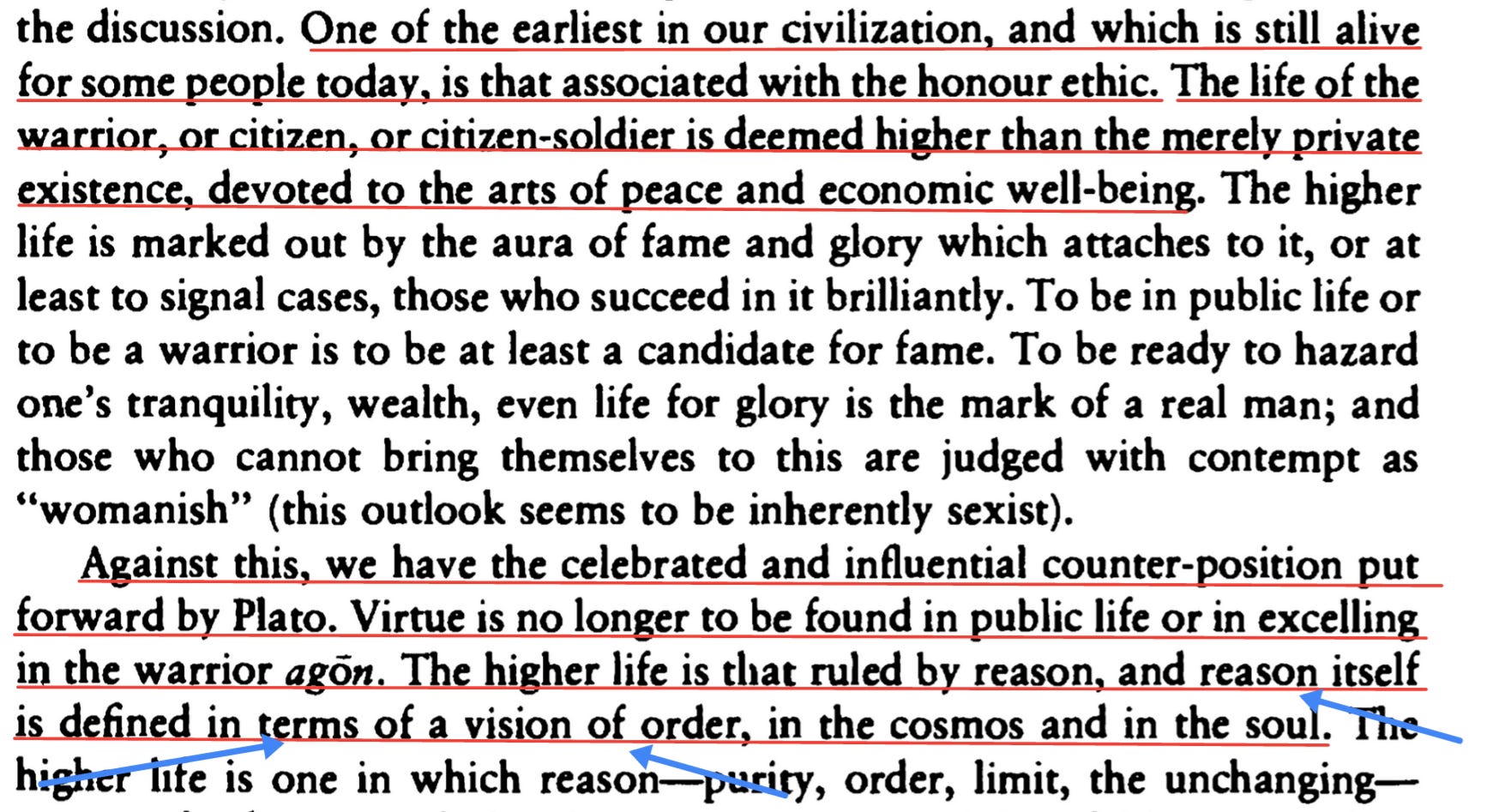 That’s how Taylor indicates that Plato was as radical as Descartes in his rejection of the warrior past before him, of replacing the world of Homer with the world of Socrates. Why is this Platonic view superstition? Wouldn’t the conservative liberal agree that replacing the warrior ethic with the life ruled by reason is a strong indicator of progress?
