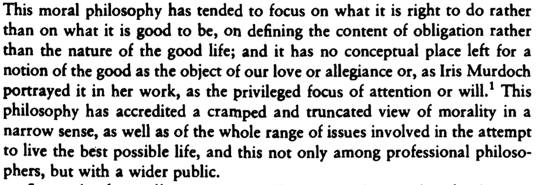 Taylor seems himself as going against the grain of his peers, who treat morality as an autonomous domain independent of what it is to live a good life. That wall between morality and the good is itself a symptom of the separation of disciplines and sub-disciplines in the classification of intellectual life and the organization of departments.
