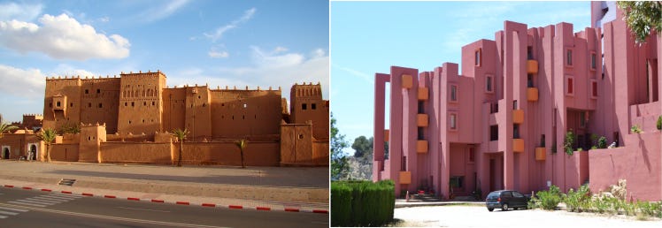 I have mixed feelings about 1 & 2, for they can create new forms of order and unleash new types of chaos. While writing this essay, I chanced upon an obituary for the Catalan-French architect Ricardo Bofill. Bofill’s buildings are known for transforming classical architectural themes into geometric forms, like how he was inspired by the Kasbah Taourirt in Morocco to create a an apartment complex in Spain called La Muralla Roja, the building on the right.
