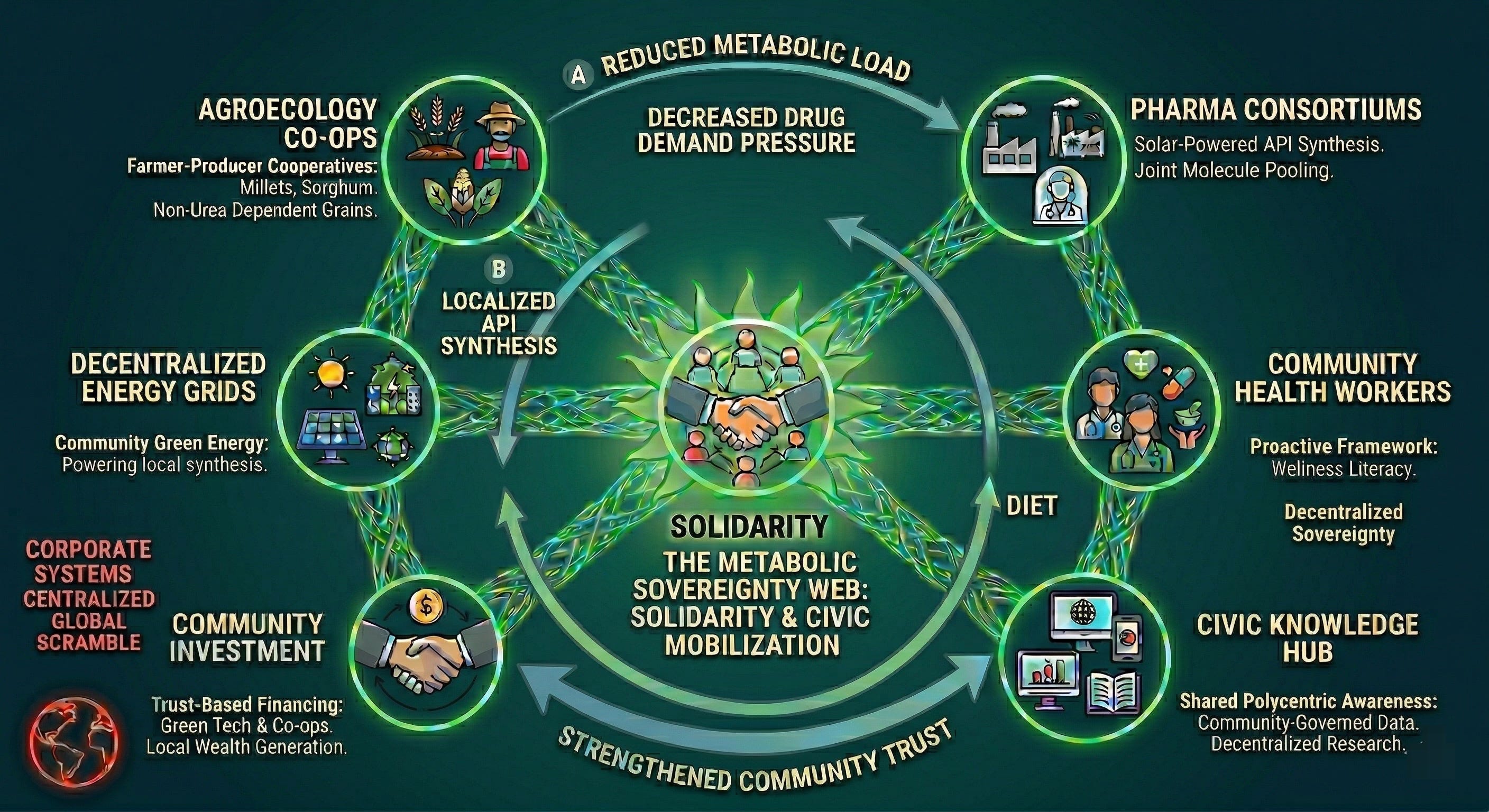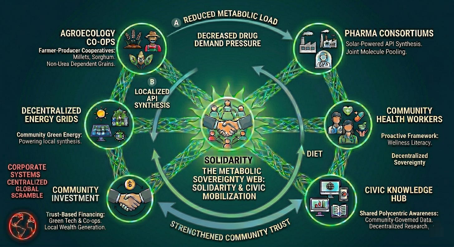 Therefore, we also need a massive, unprecedented mobilization of civic networks too. Solidarity is the only rational and moral response to a world where the conflicts are simply too large, too complex, and too planetary for any individual to survive alone. We must urgently weave localized, cooperative safety nets such as farmer-producer cooperatives sharing agroecological knowledge. We also need pharmaceutical consortiums pooling API resources and intellectual property, and community health workers prioritizing wellness over corporate margins.