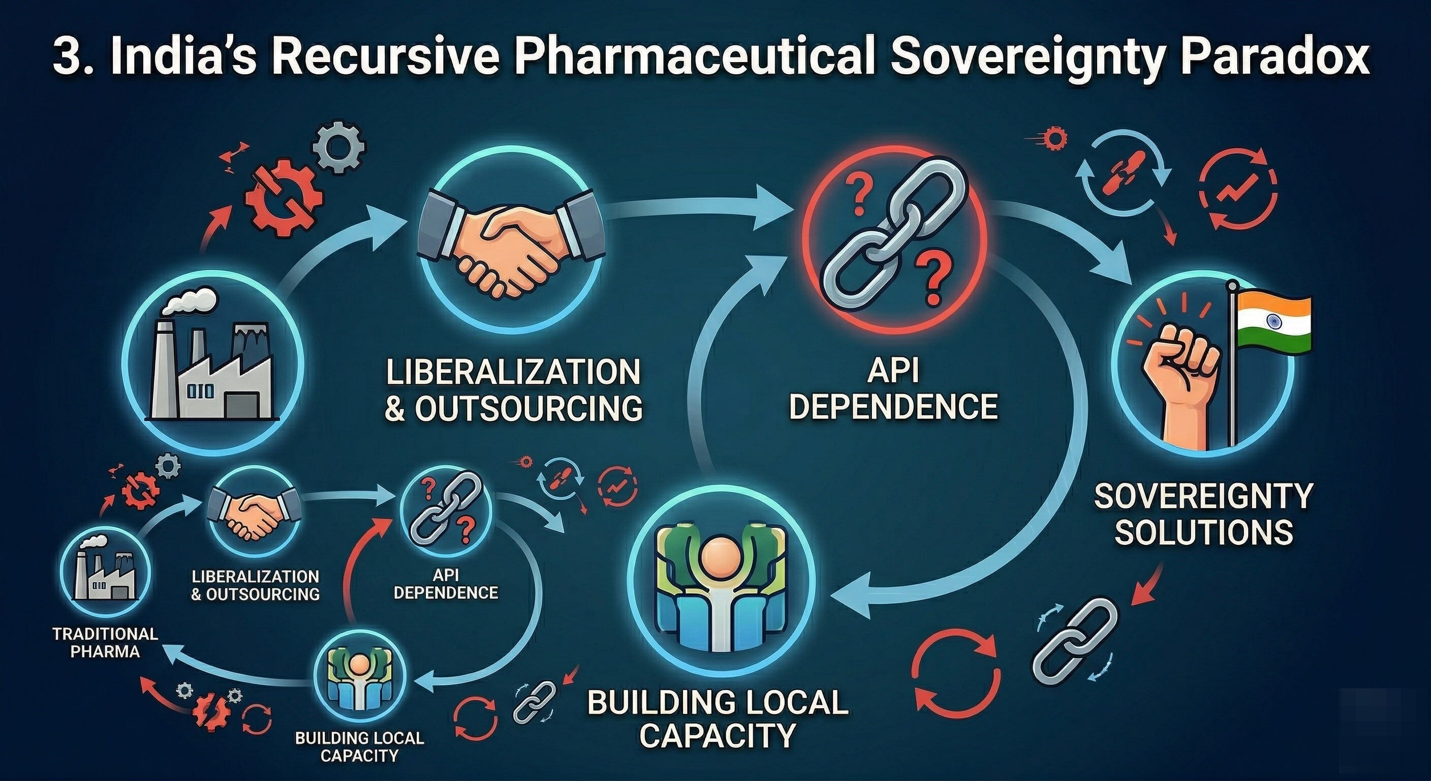 Makes sense from an individual pharma company’s POV: outsourcing API production to China was the rational choice. And so, India voluntarily hollowed out its own chemical foundation. We dismantled our fermentation plants and allowed our chemical synthesis capacity to wither because it was cheaper to buy the molecules from Shandong.
