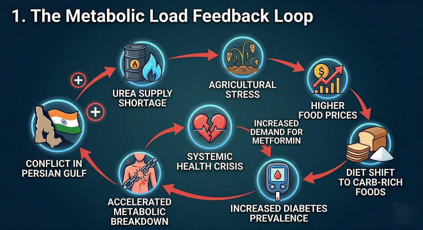 On one front, the cost of Metformin and other essential diabetes treatments could rise as API supply chains fracture, energy costs spike, and transportation insurance premiums surge. On another front, food inflation driven by fertilizer (urea) shortages will make healthy, protein-rich diets economically impossible for the majority of the population.