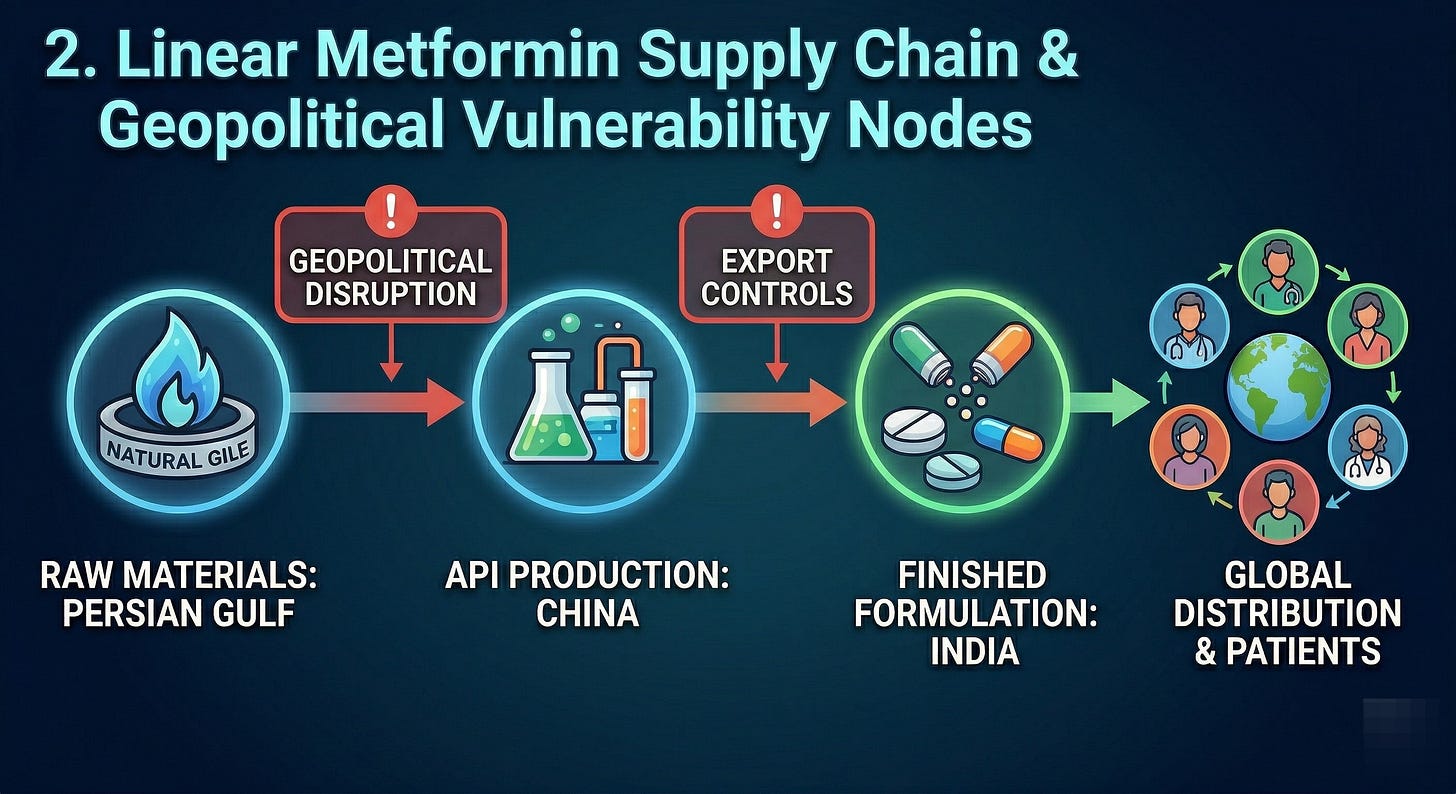 If the Gulf War creates a severe energy shock, it hits China’s chemical factories first. China, prioritizing its own domestic stability and the health of its own massive population, can easily and instantly weaponize export controls. In a time of molecular scarcity, Beijing can restrict the export of Metformin API or the critical, energy-intensive solvents required to synthesize it. Indian generic manufacturers will be starved of their core ingredients, and will find their assembly lines paralyzed.