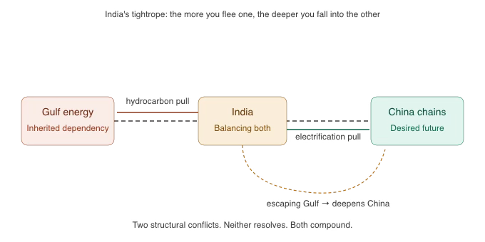 India’s rational, strategic response to Gulf energy volatility is electrification. Except the green transition depends on physical supply chains, and those supply chains run almost entirely through China: solar panels, lithium batteries, EV components, rare earths.