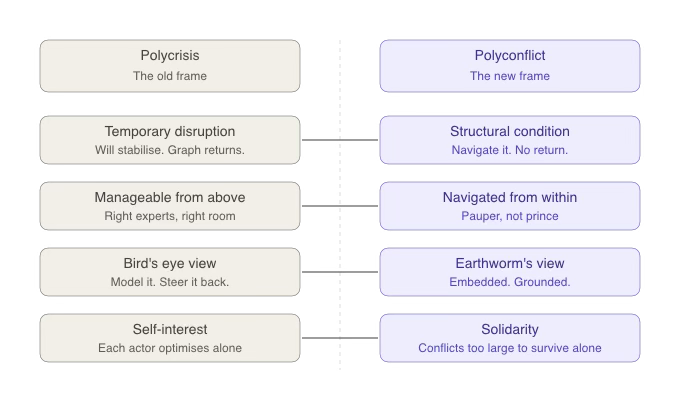 The polyconflict frame is what lends the Pauper urgency. The old frame of polycrisis was deeply embedded in neoliberal managerialism. It relied on the bird’s eye view of complexity scientists who believed that if you just modeled the system well enough, you could steer it back to stability from a control room. But we are now in the Third Systems Age. We don’t need the bird’s eye view - we need the earthworm’s view; embedded, grounded, sensing the vibrations of the soil, and navigating from inside the conflict rather than trying to administer it from above.