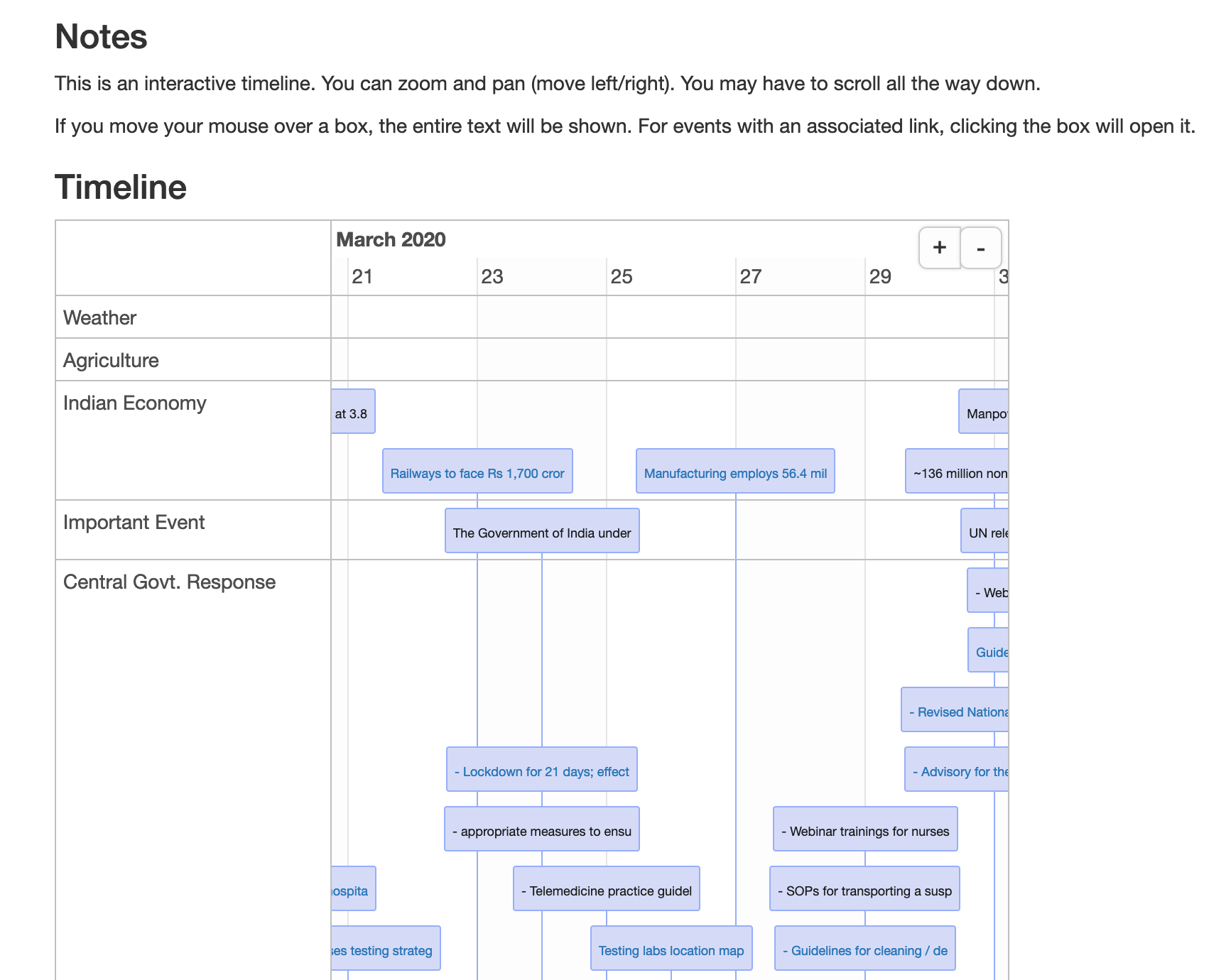 All of these questions are arranged on a timeline of events with interactions — most of the time we can only assert the order of events with any certainty, the exact size or impact of an event may remain unknown. We are beginning to create a timeline for the COVID19 crisis in India.