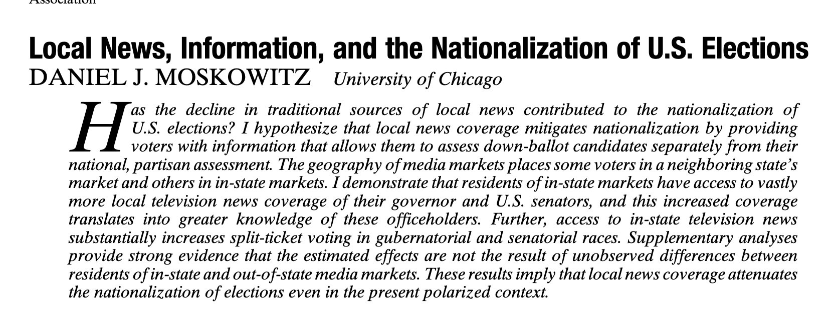 Useful reference: Daniel J. Moskowitz. 2021. "Local News, Information, and the Nationalization of U.S. Elections." American Political Science Review 115(1): 114-129