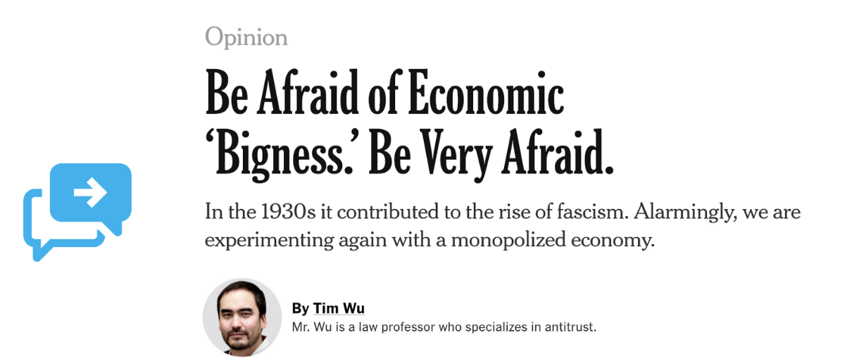 Another reason monopolies work is because it’s easier for them to lobby for favorable policies; they don’t need to worry about competitors with different priorities. Every acquisition by Amazon or Google or Bayer makes it easier for them to get laws passed in their favor and also easier for them to lobby against Verizon or Comcast for net neutrality. It’s easier going against a heavyweight if you’re one yourself.
