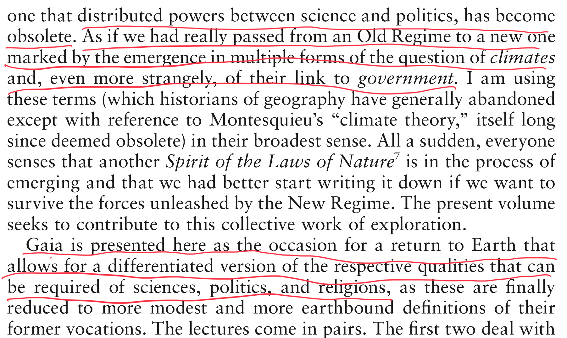 Replacing one science by another science is not enough: we have to renew the philosophical impulse in the light of this return. Also, meditating on our condition isn’t enough if we set aside the context in which that condition is now embedded: the Planet. Bruno Latour makes a version of that point in his recent book, Facing Gaia.