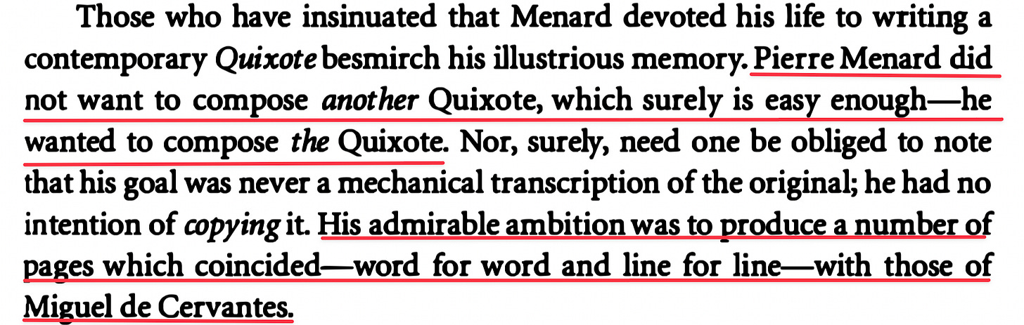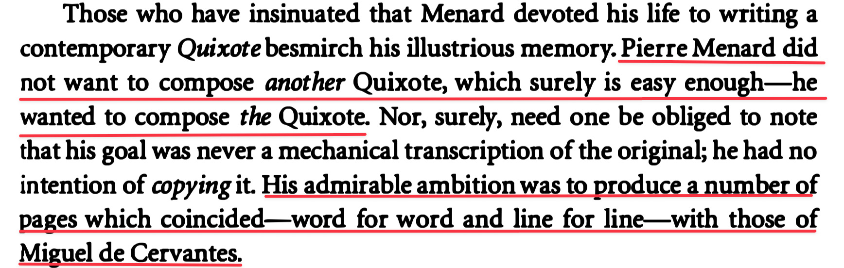 Once upon a time, novelists and logicians talked to one another. Pierre Menard was one of the last exemplars of that extinct species. His practice of left-handed Tantra isn’t well known, but he spent many years of his life writing Don Quixote.