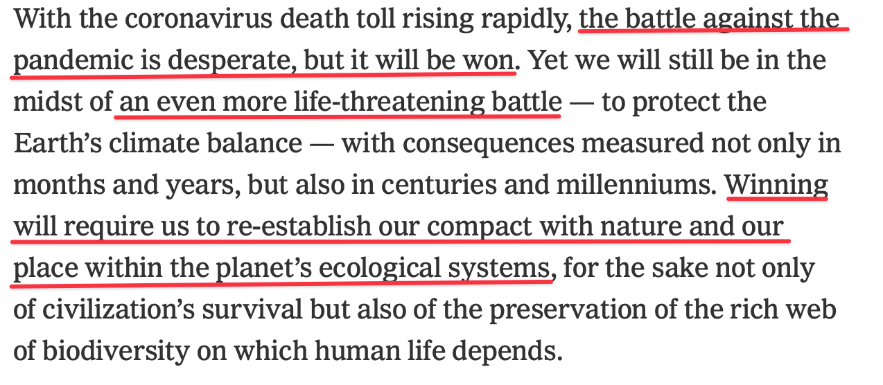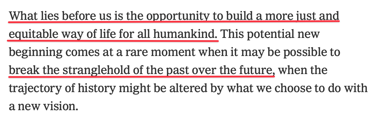 And then he talks about the climate crisis is an opportunity to renegotiate the basic contract of society, of building ‘a more just and equitable way of life.’ It’s easy to laugh this off as propaganda, but if liberalism isn’t able to offer this possibility as a genuine and likely outcome of its method, it will fail. The architects of the liberal order know that. But that requires a recognition of the fact that the real battle has moved to a higher and more treacherous terrain:
