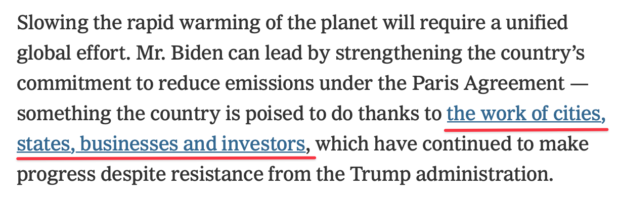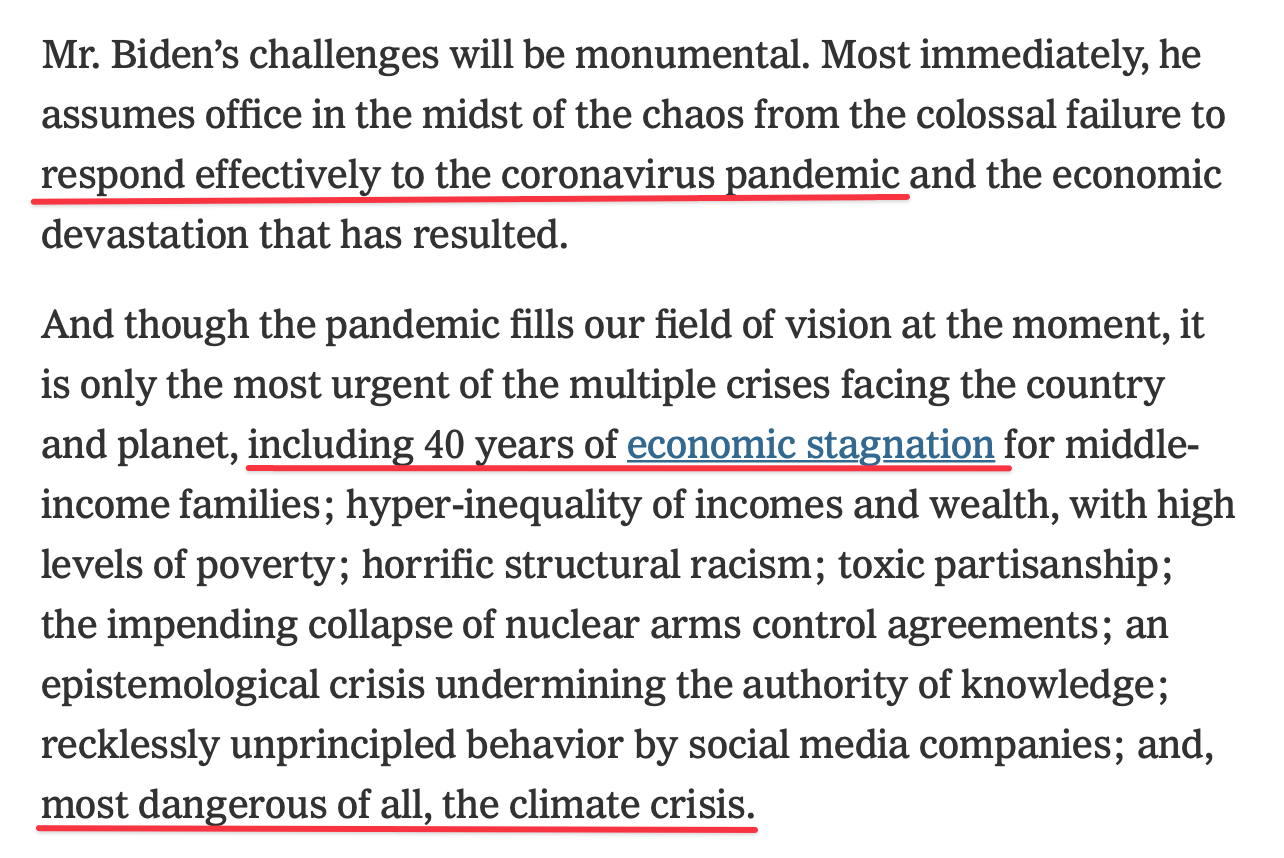 The pandemic was Trump’s downfall and a successful response to the second phase - vaccine distribution, followed by a strong economic recovery - could be the making of Biden’s presidency. Note how Gore frames the most important problems facing Biden - he starts with the economy and ends on a high note with climate. That’s the universality of the market speaking right there: you can’t talk about climate without talking about how to put bread on the table.