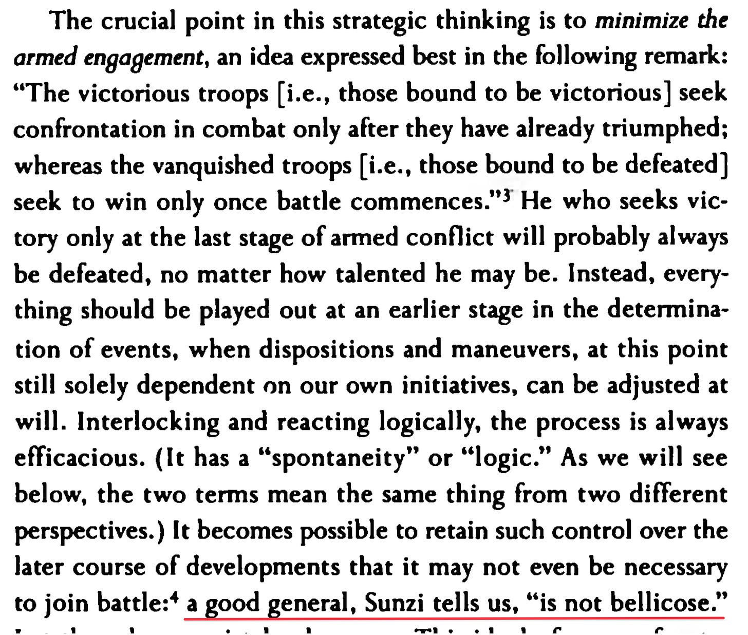 In his book on the Propensity of Things, Francois Jullien starts his discussion of Shi (the Chinese concept that’s the main concern of Jullien’s book) with an analysis of military strategy. He talks about how a good general senses the natural order of the terrain, his weapons and other resources and arranges them in a manner that assure victory. It’s not victory due to heroism or clever battlefield maneuvers - the standard fare in Indo-European myth as well history - but due to the general being at the right place at the right time.