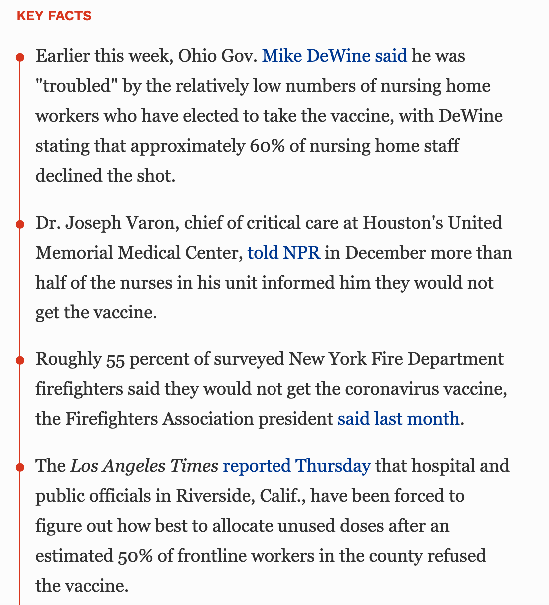 It took the fossil fuel industry decades to sow doubt on climate change, but it looks like conspiracies about vaccines are emerging and spreading in real time. An alarming number of American healthcare workers are refusing to take the vaccine. The vaccine has been produced in record time, but the speed might also concern people who are worried about side effects. I think that’s too rational an explanation though; perhaps the atmosphere of distrust impacts healthcare workers seeing as they are under so much stress.
