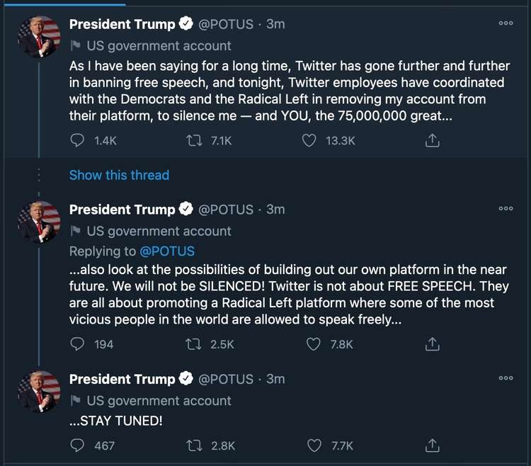 Facebook has also banned Trump for an indefinite period of time. Deplatforming Trump has been a demand in the liberal sphere for a very long time, but it’s only happened after he lost the presidency, the run off elections in Georgia (so that both the executive and the legislature belong to the Democrats) and after direct incitement to violence from Trump that led to the storming of the Capitol. Trump tried to subvert the ban by using his presidential account but that too was blocked.