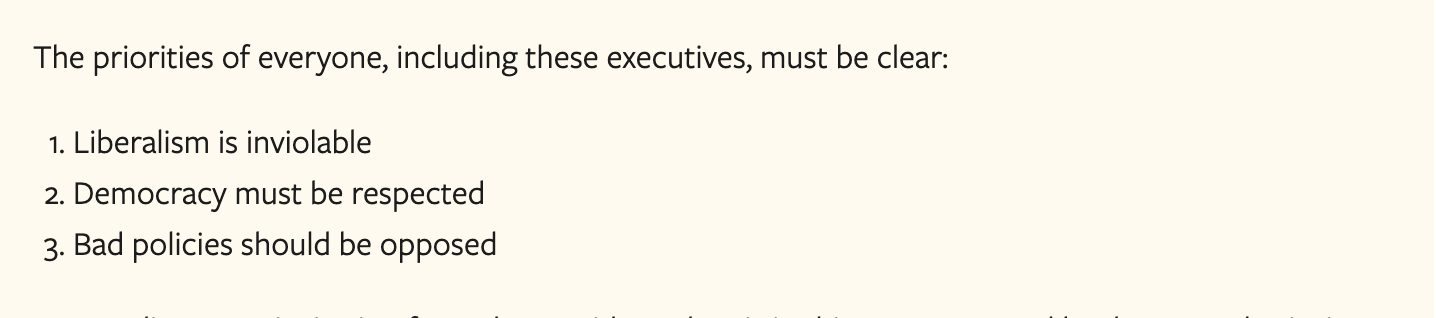 Don’t get me wrong: authoritarians have to be resisted at every step and aggressive moves are needed, but doing so by handing over even more power to corporations - they are now truly too big to fail - just because they happen to agree with your form of social liberalism (while resisting any attempt to regulate their business models) is going down a very slippery slope.