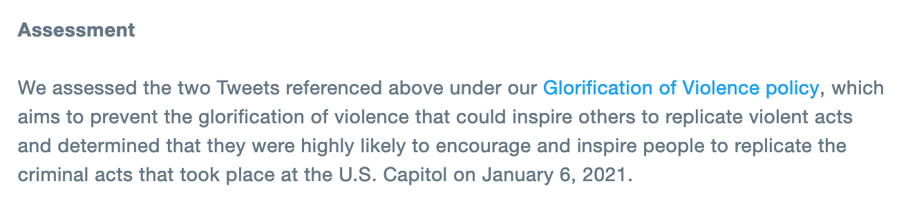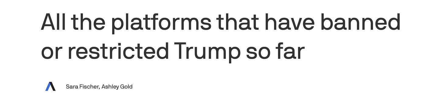Most of my liberal friends are celebrating the decision, but I think it’s a really bad idea. It gives the tech giants a free pass on years and years of profit seeking from anger and falsehoods and only removes one individual’s capacity - however dramatic - to influence what people choose to believe. Ben Thompson at Stratechery has a thoughtful piece that argues the opposite. He starts with the following claim:
