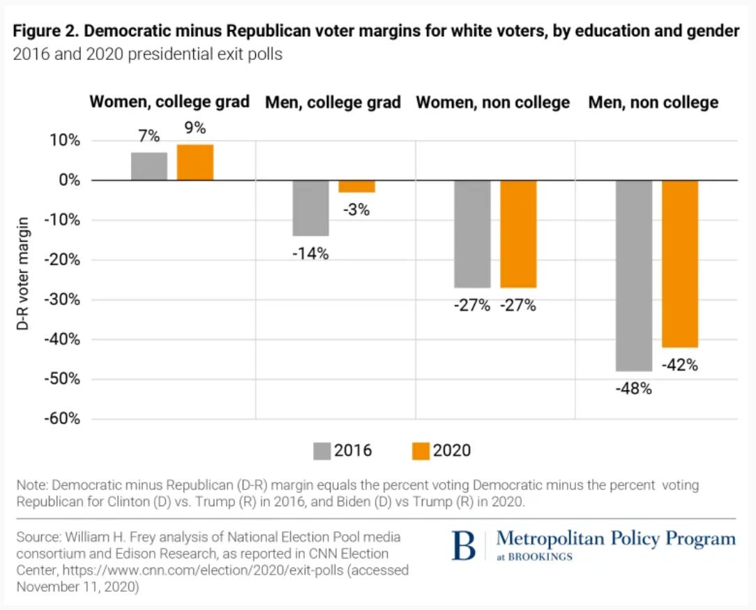 This being a strange year, Trump gained votes in every POC group and lost share among white voters, even if his advantage remains solid. Where did he lose white votes? White college educated men made the biggest shift.