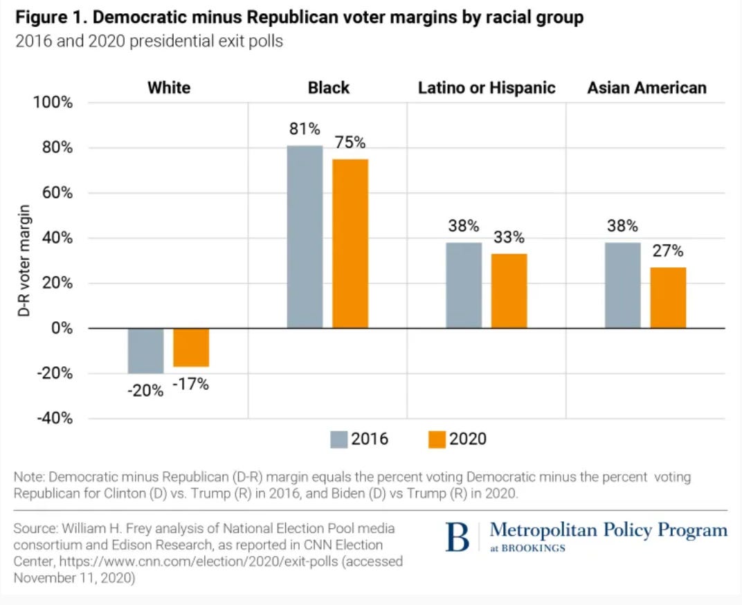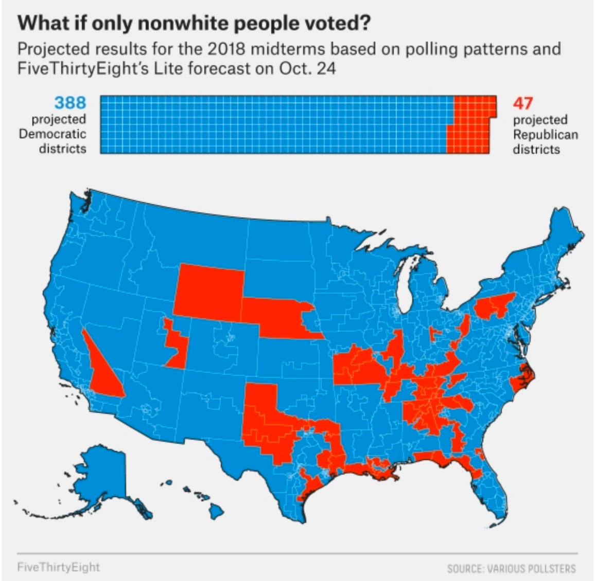Such shifts have happened in the past. Do remember that it’s the Republicans who ended slavery and the south was solidly Democratic until the 60s. Republican == White is a relatively new phenomenon. Having said that, party correlation with race is overwhelming. Mapping votes by geography makes it stark