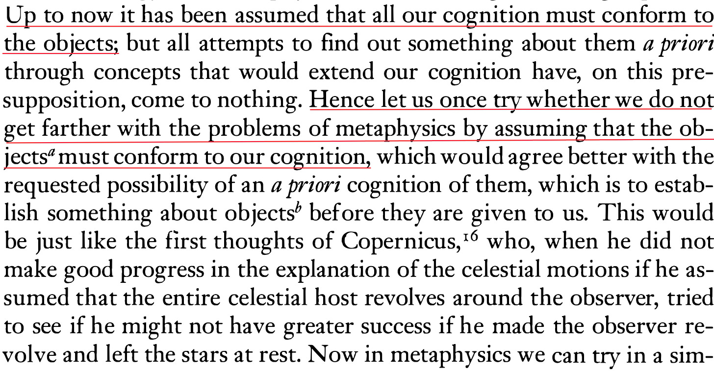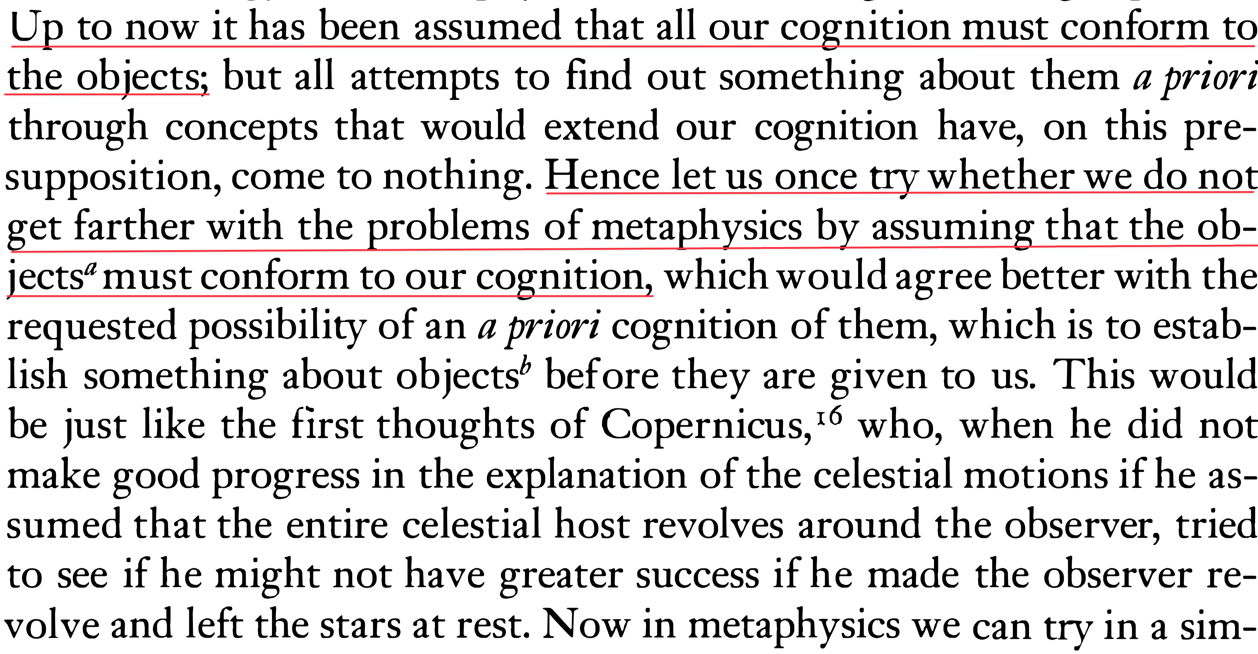 That’s Kant’s Copernican revolution in philosophy. One way to think about objects conforming to our cognitions: the world isn’t intelligible without an organizer. Kant argues that two kinds of naive views are untenable: