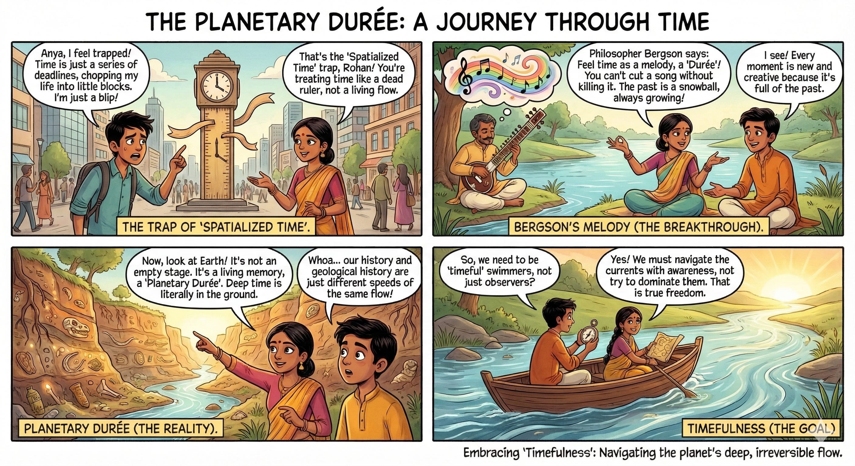 Applying durée to philosophical engineering suggests that we cannot fix the planet through spatial interventions alone. Instead, we must account for the irreversibility of time. Just as a melody is ruined if you try to isolate a single note, planetary metabolism is a continuous flow where the past (carbon deposits, evolutionary leaps, colonial histories) is inextricably woven into the future. By treating the planet as a being in planetary durée, our framework moves away from the dead time of the clock and toward a living time of the biosphere. It suggests that human agency is most free when it stops trying to dominate the planet as a spatial object and starts participating in its duration as a creative process.