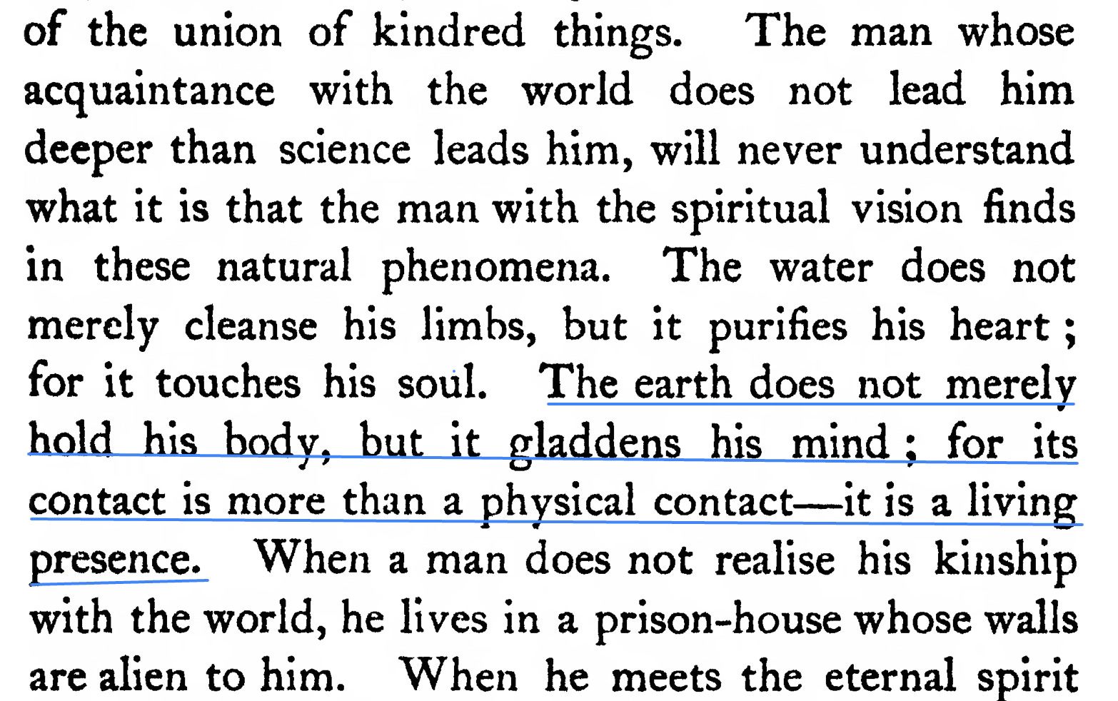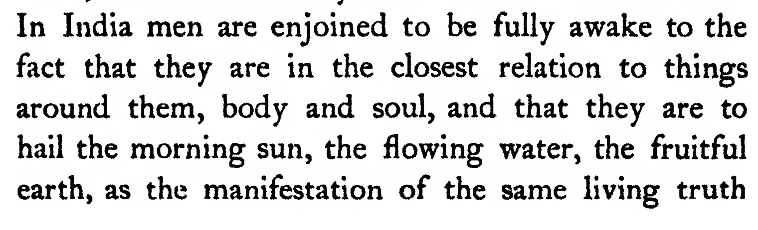 While it’s possible to draw a line connecting these thoughts with the original texts of the Hindu tradition (Tagore cites the Gayatri mantra as inspiration), it’s also possible to read them in a straightforward way as an expression of nature mysticism.