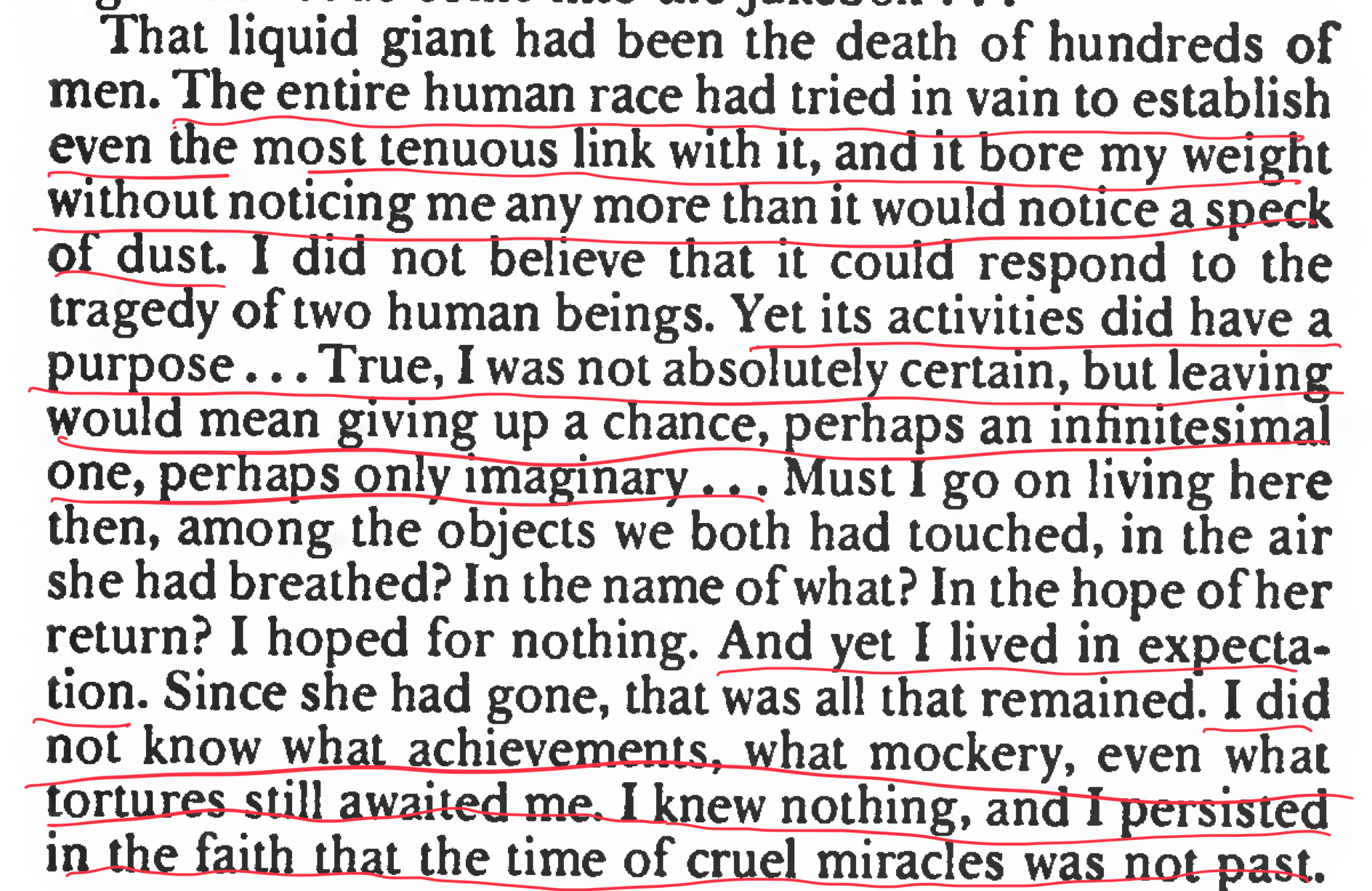But he can’t shake the feeling that there’s something there for him. Perhaps not intellectual understanding, a theory of how Solaris works, but a visceral bond from one being to another.