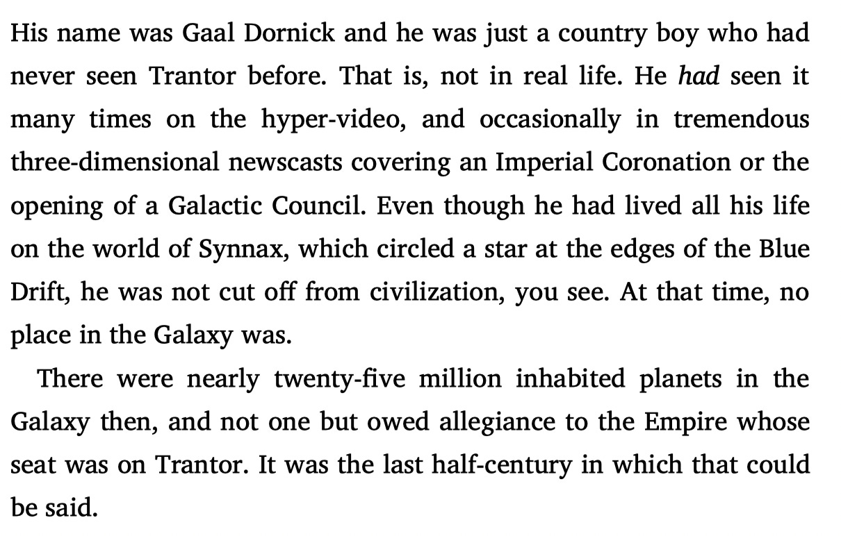 Hard Science Fiction, if not Science Fiction as such, is the story of society’s victory over nature, so complete a victory that society has left the earth and wanders the universe. Like the start of Asimov’s Foundation series, where country —> city has been replaced by Galactic Rim —> Galactic Center.