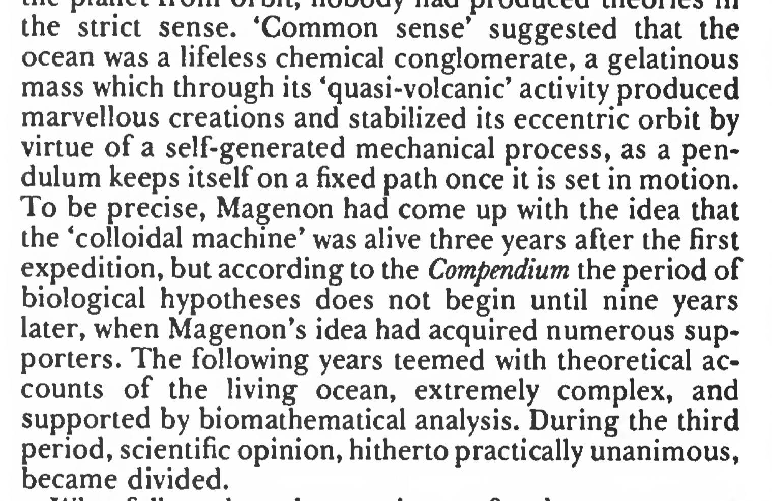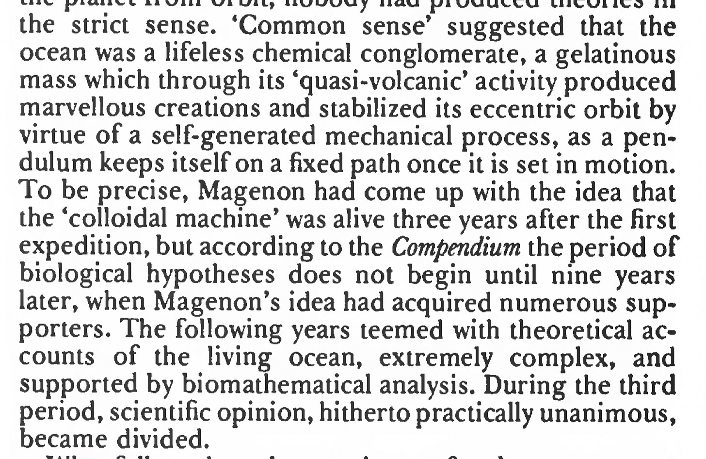 Solaris is distant from us in both dimensions. It’s internally dynamic, with ceaseless activity in its oceans and atmosphere, but it isn’t one entity in a medium that contains multitudes nearby. It’s also a millions of times bigger than us.