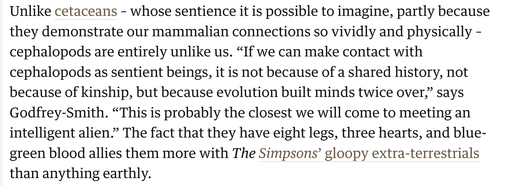 Even octopuses are recognizably sentient. They hunt and hide as we would in the those circumstances. Some squirt water at people they don’t like. Others steal crabs from fisherman.