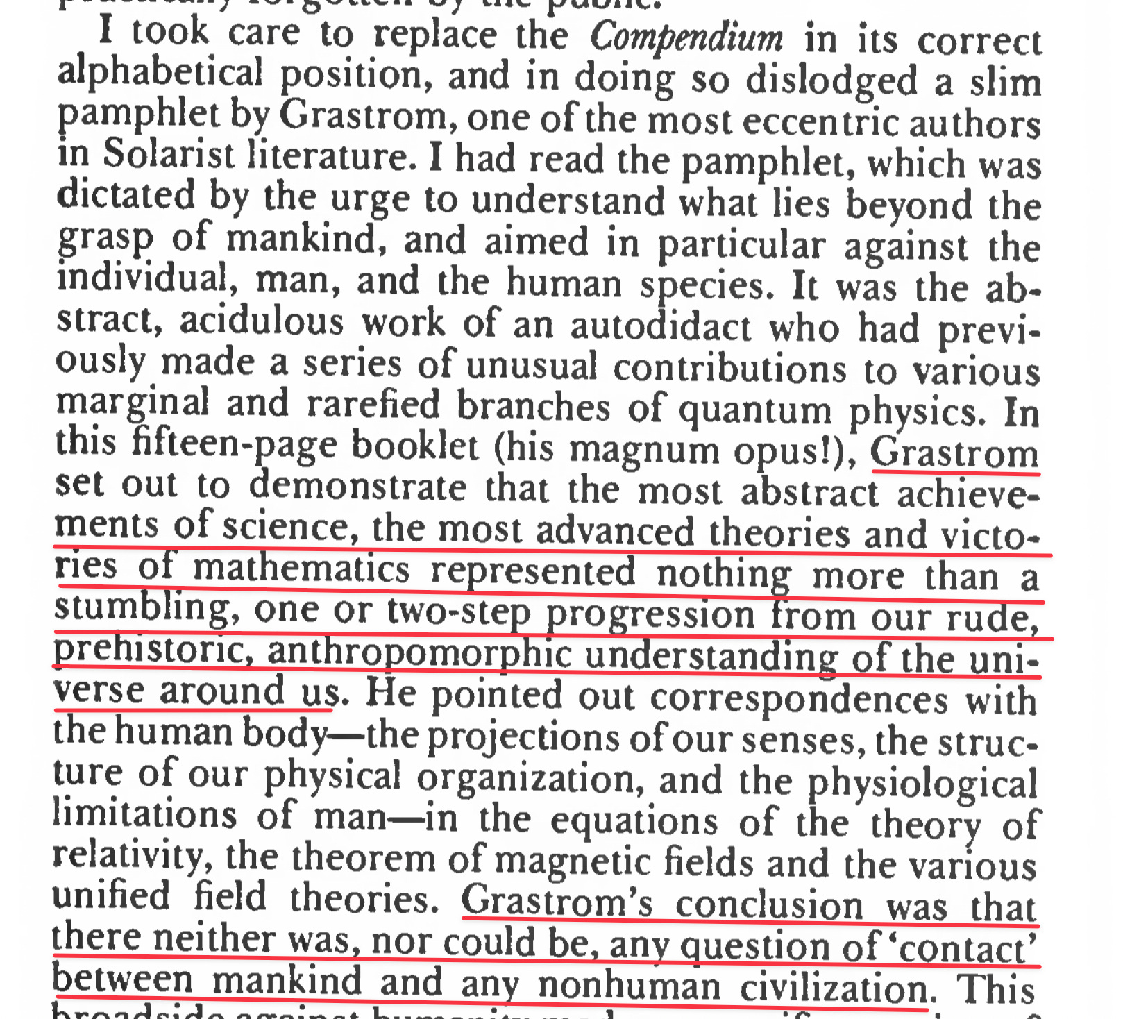 Lem vacillates between these two extremes. He’s pretty convinced that we aren’t up to the task, that we are condemned to anthropomorphize a being that repels all anthropomorphism.